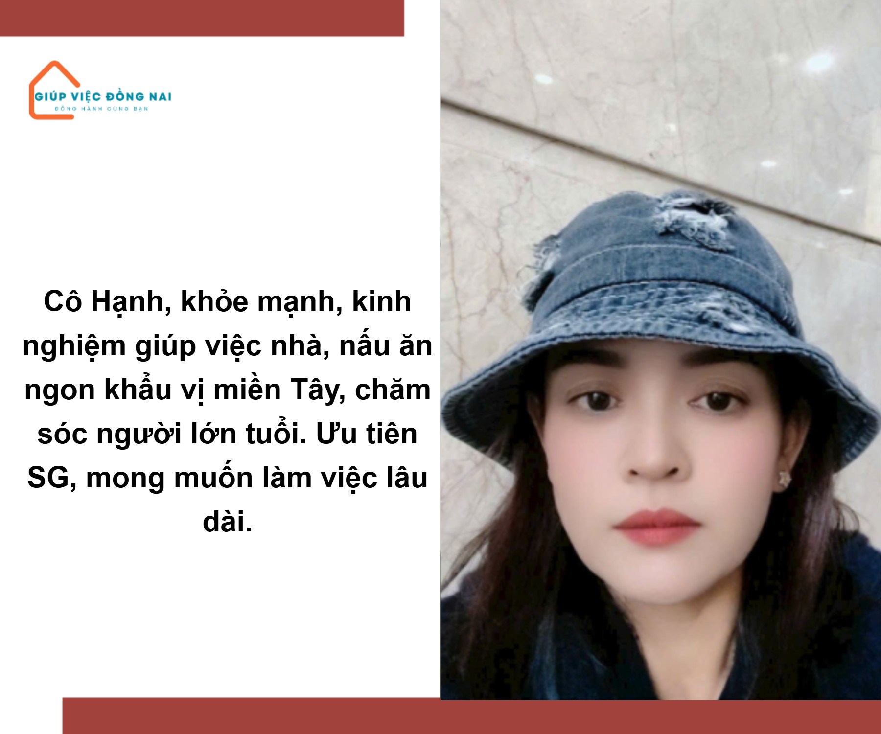 + Sức khỏe tốt, chị làm được nhà 2 lầu, chung cư. Giỏi việc nhà, chăm sóc cho gia đình tốt, tỉ mỉ, cẩn thận, làm việc nhanh chóng, gọn gàng, sạch sẽ. Biết sắp xếp, chủ động trong công việc.