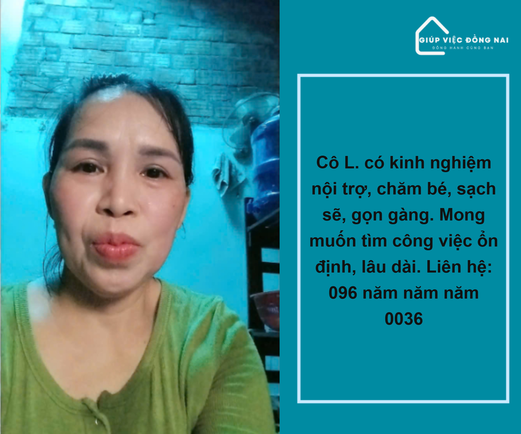 Đăng giúp người thân cần việc giúp việc nhà. Chào mọi người, em đăng tin giúp người thân đang cần tìm việc làm giúp việc nhà hoặc chăm bé ạ. Cô có kinh nghiệm và rất yêu trẻ con. Anh chị nào có nhu cầu hoặc biết ai cần thì giới thiệu giúp em với nha. Cảm ơn mọi người nhiều ạ! 09б555ООЗб
