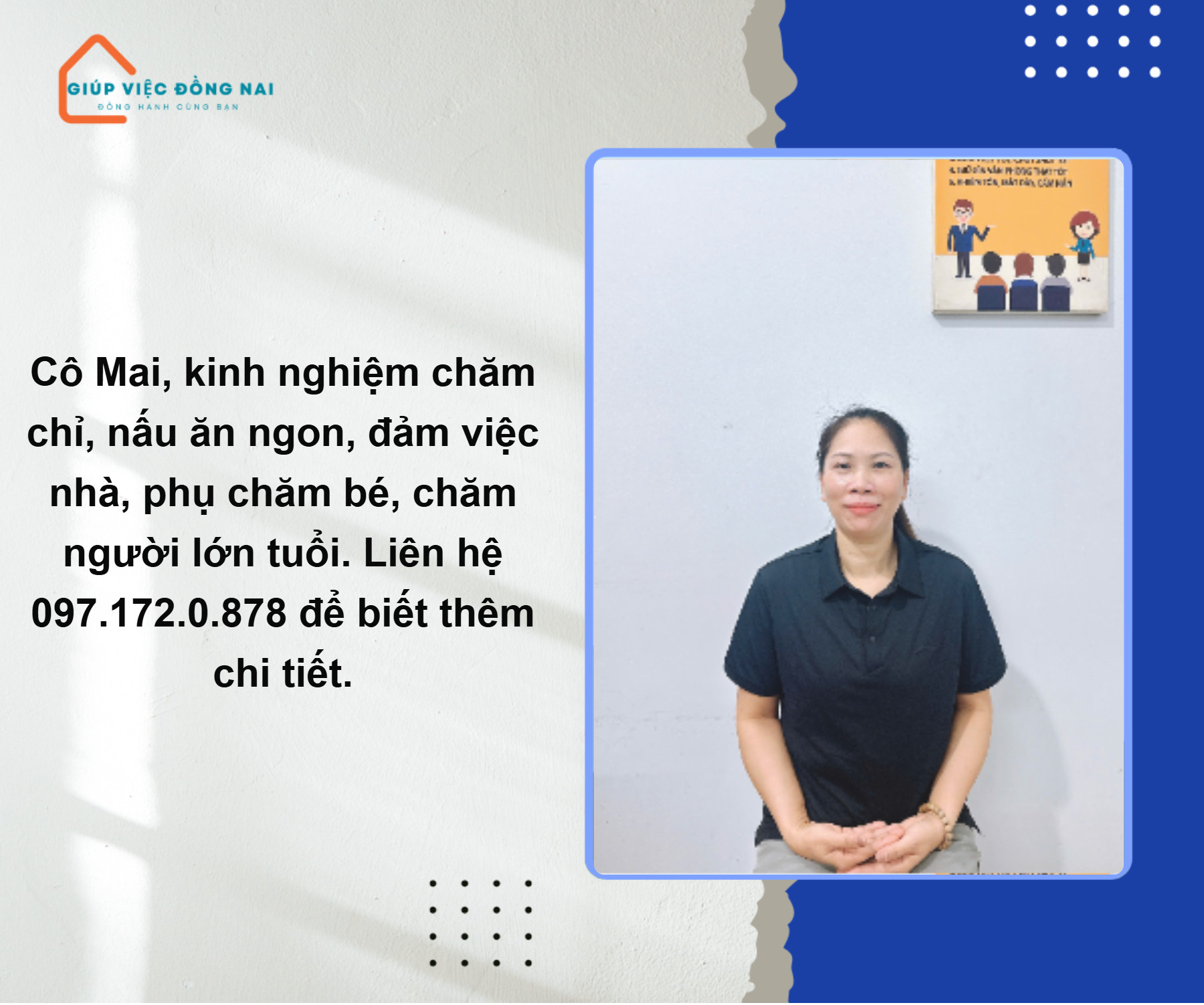 + Giúp việc nhà, phụ chăm ông ở Thủ Đức được 1 năm.