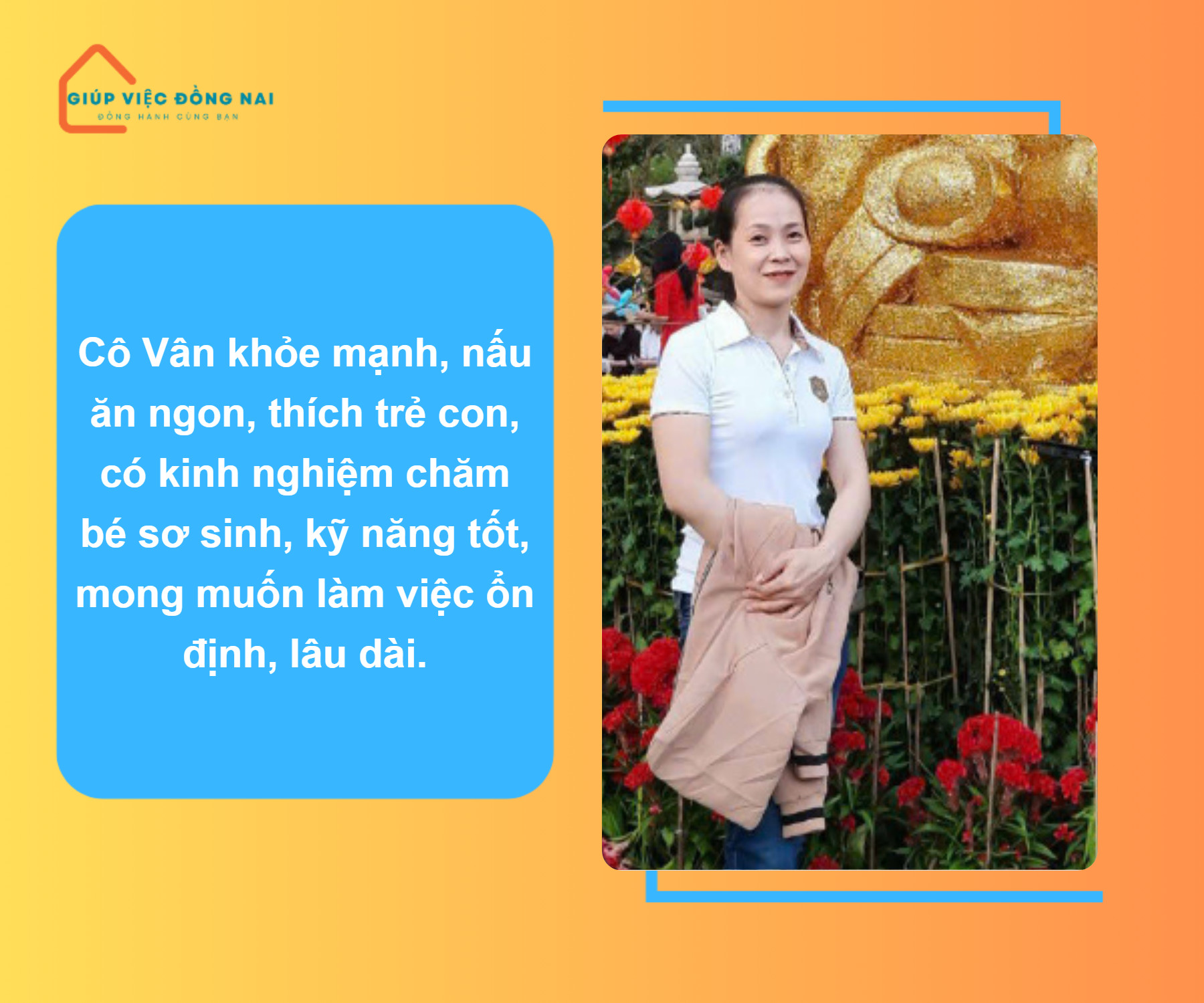Em xin giới thiệu chị Cẩm Vân, sinh năm 1986, hiện đang tìm công việc chăm sóc em bé hoặc phụ giúp việc nhà. Chị Vân có nhiều kinh nghiệm chăm sóc trẻ nhỏ, đặc biệt là bé sơ sinh. Chị đã từng chăm bé từ lúc mới sinh đến khi bé đi học trong 3 năm.
