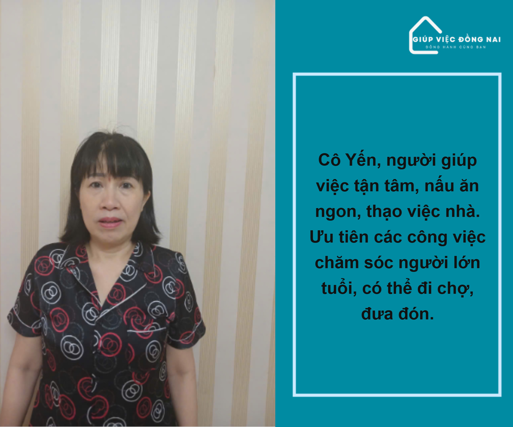 + Cô yêu thương người lớn tuổi, Ông bà sống một mình chị chăm sóc chu đáo, lo cơm nước, thuốc thang đúng giờ. Tâm sự với ông bà.