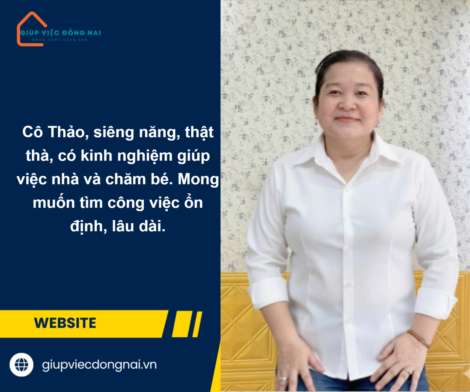 Kinh nghiệm: + Giúp việc nhà ở Củ Chi đươc 1 năm + Giúp việc nhà phụ chăm bé ở quận 7 được 1 năm Ưu điểm: -Chị người miền Tây chịu khó, thật thà, biết cách ăn nói, có việc phù hợp chị nhận làm,không kén chọn việc. - Sạch sẽ gọn gàng, chị rất giỏi việc và chịu khó, khéo léo và rất biết cách sắp xếp công việc nhanh chóng để gia đình sinh hoạt thoải mái. -Nấu ăn được theo khẩu vị miền Tây . Biết cách lên thực đơn đa dạng cho gia đình.Biết điều chỉnh theo khẩu vị chủ nhà yêu cầu. - Nhà rộng hay 2 lầu chị đều làm được. - Ủi đồ được, thành thạo các thiệt bị hiện đại trong gia đình. Là người luôn chủ động, ham học hỏi biết lắng nghe tiếp thu ý kiến chủ nhà. -Chị thương con nít, khi rảnh chị phụ giúp bố mẹ chăm bé lớn đi học về có kĩ năng chăm tốt, nấu ăn, ăn uống đúng giờ, vệ sinh kĩ. - Mong muốn đi làm tìm công việc phù hợp gắn bó lâu dài.