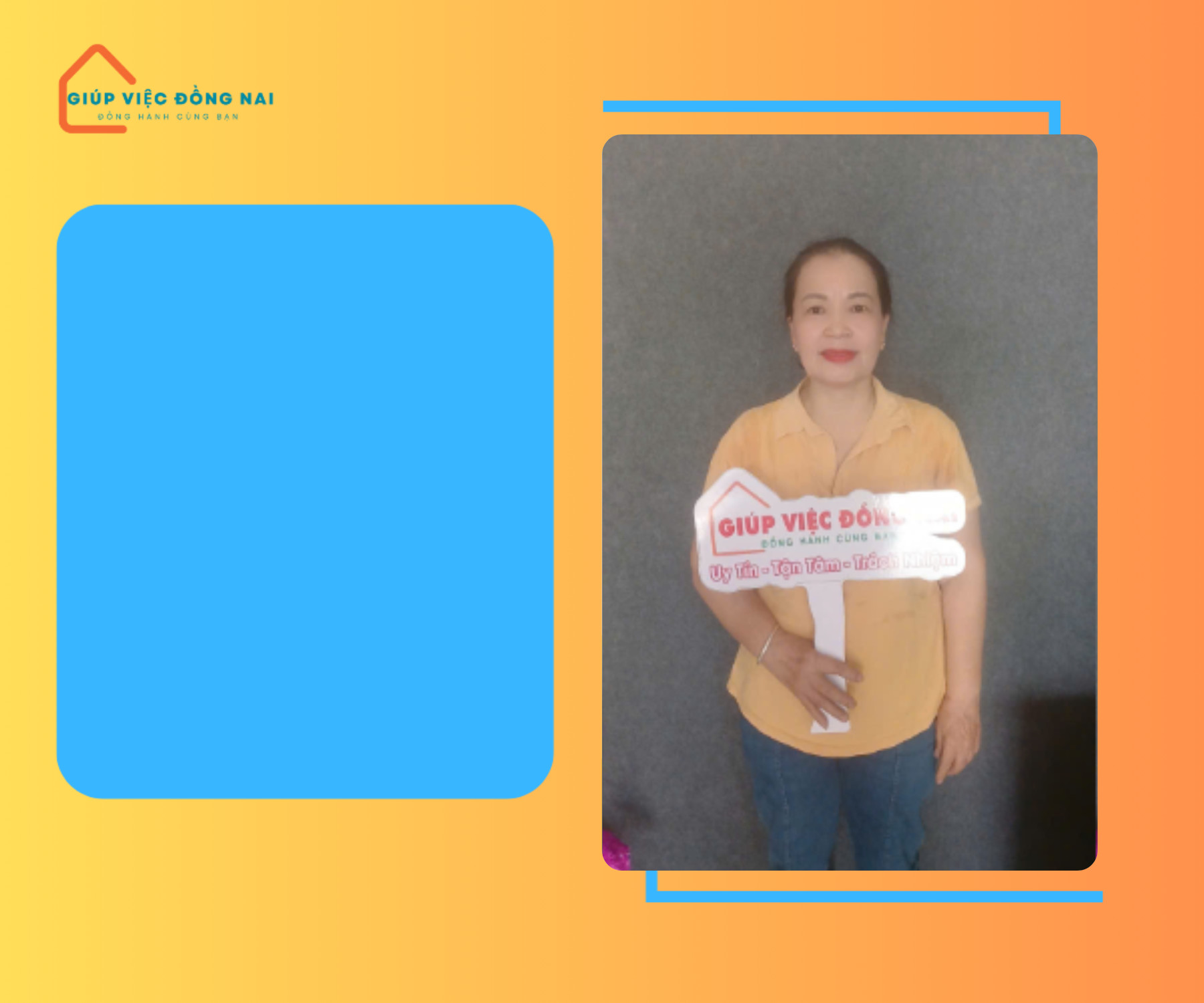 Kinh nghiệm: + Giúp việc nhà phụ bán café ở quận 4 được 1 năm + Nội trợ chính trong gia đình Ưu điểm: - Tính cô hiền lành, thật thà, chịu khó trong công việc. Biết cách sắp xếp, quán xuyến công việc nhanh chóng theo yêu cầu của chủ nhà - Nấu ăn ngon nhiều món miền Bắc . Biết cách lên thực đơn đa dạng cho gia đình.Biết điều chỉnh theo khẩu vị chủ nhà yêu cầu - Sức khỏe cô tốt, làm nhà rộng từ 2 lầu chị làm được, không nề hà công việc - Thành thạo các thiệt bị hiện đại trong gia đình. Là người luôn chủ động, ham học hỏi biết lắng nghe tiếp thu ý kiến chủ nhà. - Mong muốn đi làm tìm công việc phù hợp gắn bó lâu dài. Chị nhận việc Đồng Nai. không say xe, đi được xe máy, không ngại chó mèo. Thái độ rất thiện chí.