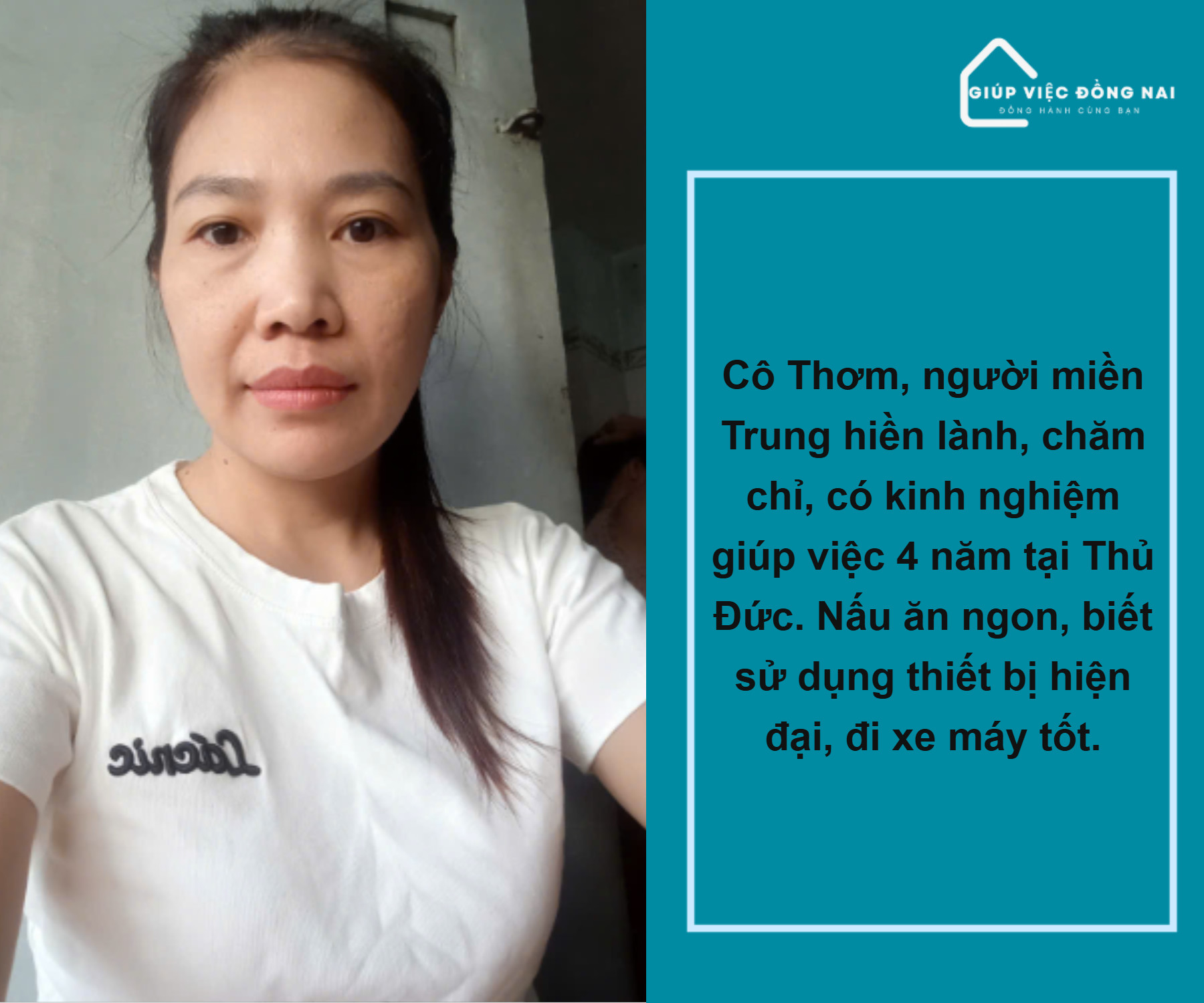 Kinh nghiệm: + Giúp việc nhà và nấu ăn tại Thủ Đức được 4 năm + Nội trợ lâu năm trong gia đình Ưu điểm: + Sức khoẻ tốt có thể làm nhiều việc như nấu ăn rửa chén, dọn dẹp vệ sinh.. + Sạch sẽ gọn gàng, chị rất giỏi việc và chịu khó, khéo léo và rất biết cách sắp xếp công việc nhanh chóng để gia đình sinh hoạt thoải mái. + Các thiệt bị hiện đại trong gia đình chỉ qua chị đều biết. Là người luôn chủ động, ham học hỏi biết lắng nghe tiếp thu ý kiến chủ nhà. + Chị tự tin nấu ăn ngon nấu được nhiều món đơn giản cho gia đình khẩu vị miền Trung. + Đi xe máy tốt, có thể đi chợ, hỗ trợ đưa đón bé đi học khi cần *Tính tình: + Chị người miền Trung , thật thà, mộc mạc, chất phát, nói chuyện dễ mến, hiểu chuyện, chịu khó trong công việc + Cô nói chuyện nhẹ nhàng dẽ mến + Rất thiện chí đi làm, mong muốn tìm được gia chủ yêu thương, mong muốn gắn bó lâu dài