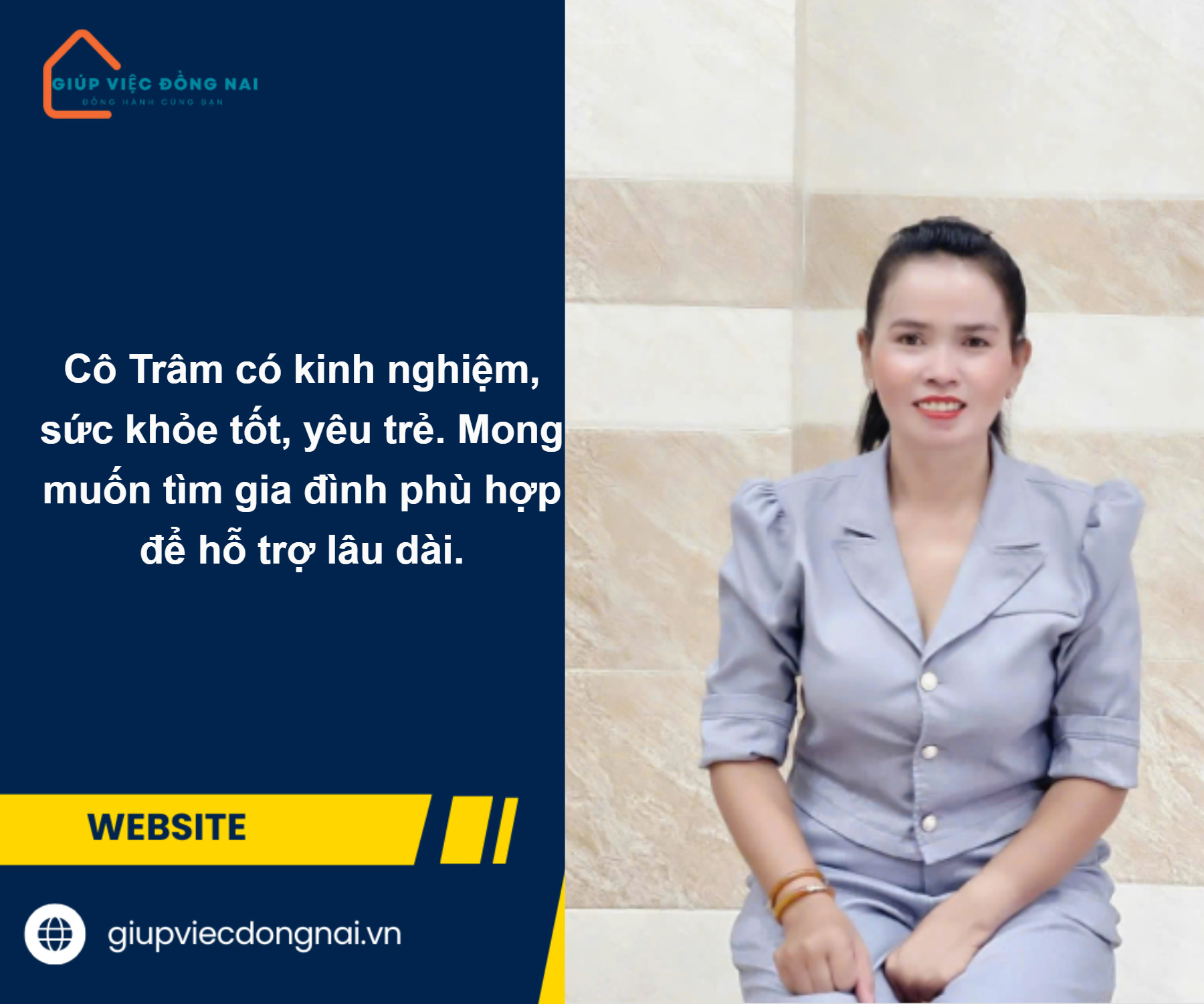 Cô Trâm có kinh nghiệm chăm sóc trẻ từ sơ sinh, rất mát tay trong việc chăm sóc bé ăn ngủ ngon, phát triển tốt. Cô biết sử dụng các thiết bị hiện đại cho mẹ và bé, nấu các món ăn dinh dưỡng. Cô có thể chăm bé cả ngày lẫn đêm, yêu thương trẻ con và mong muốn hỗ trợ gia đình như người thân.