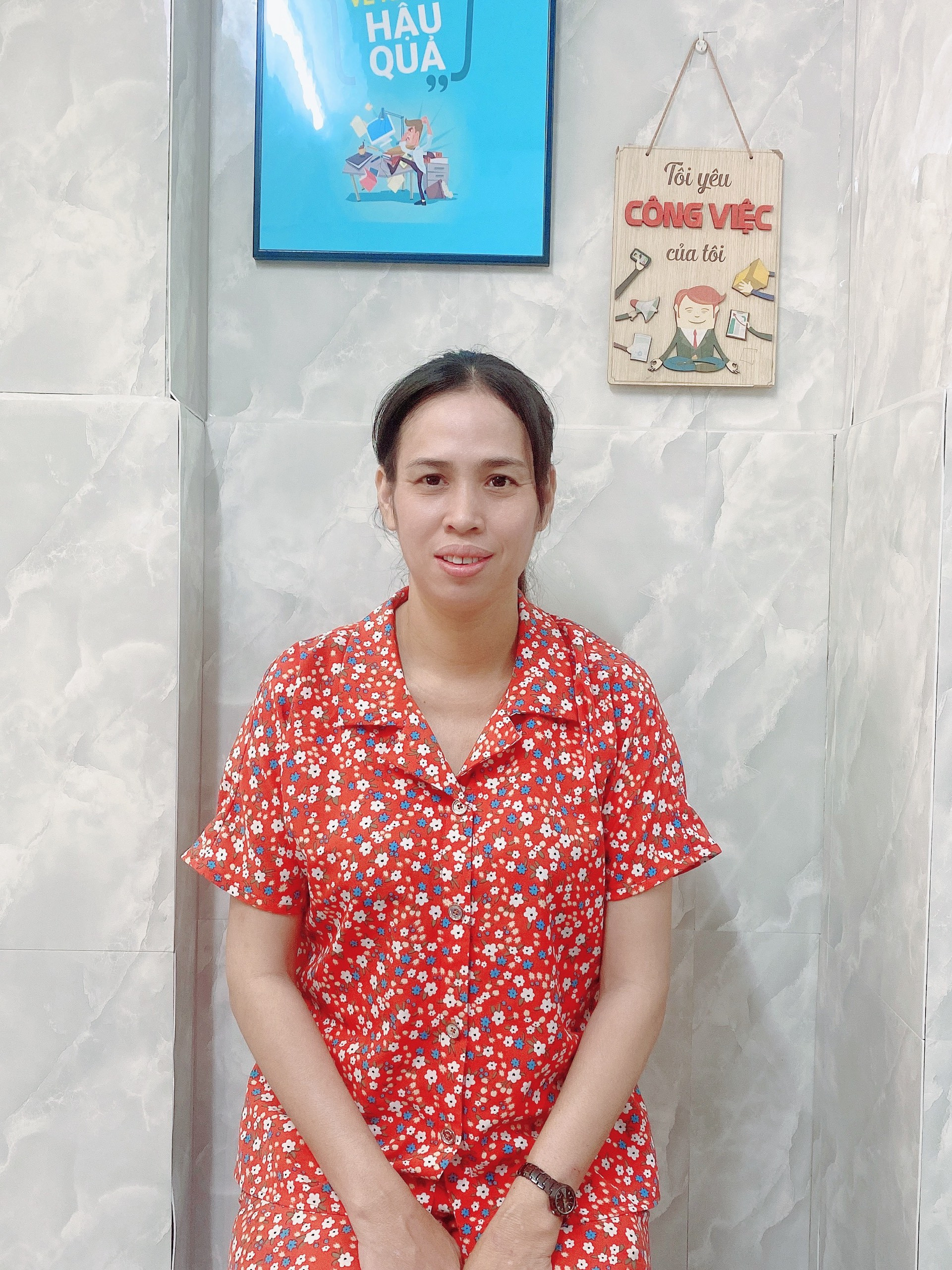 Ông xã ở quê làm công nhân, chị có 2 cháu đang học cấp 2 gia đình khó khăn chị đi làm kiếm tiền cho con ăn học trang trải cuộc sống gia đình