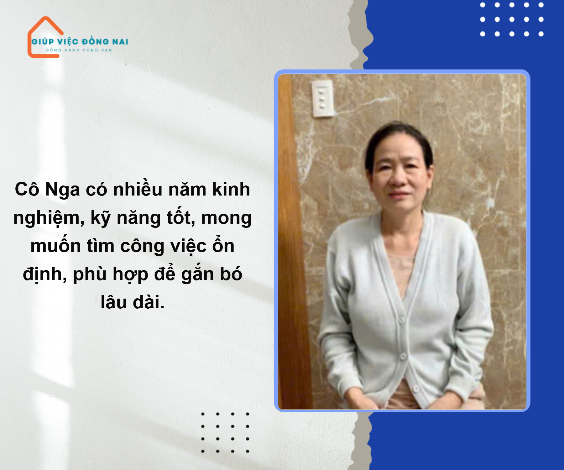 Cô Nga, sinh năm 1972, là một người phụ nữ hiền lành, thật thà và rất chịu khó. Cô có nhiều năm kinh nghiệm trong việc chăm sóc trẻ nhỏ và quán xuyến công việc gia đình.