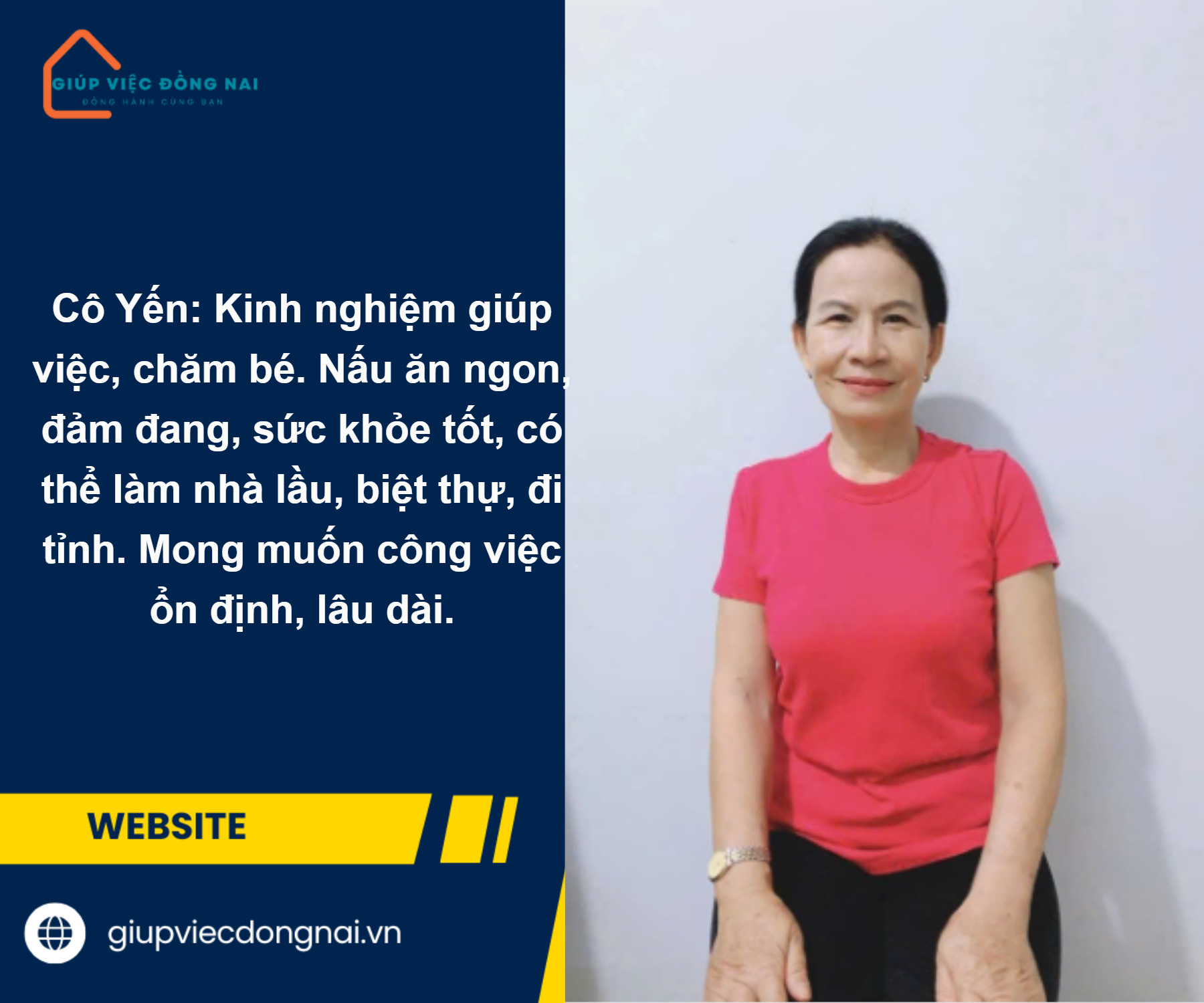 Cô Yến năm nay 54 tuổi, quê Đồng Nai, là người chân thành và không ngại khó. Cô mong muốn tìm được một công việc giúp việc nhà và chăm bé ổn định, lâu dài.