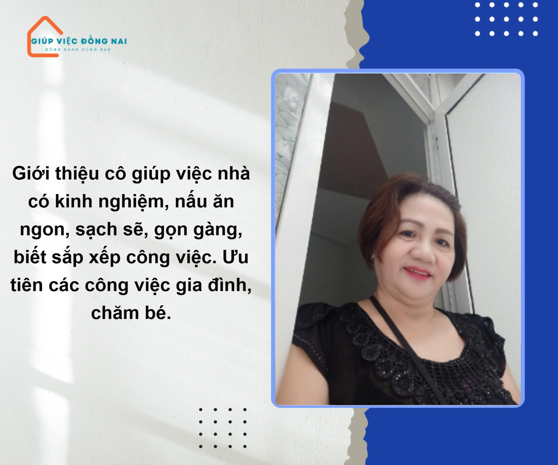 + Sạch sẽ gọn gàng, thạo việc và rất biết cách sắp xếp công việc nhanh chóng để gia đình sinh hoạt thoải mái.