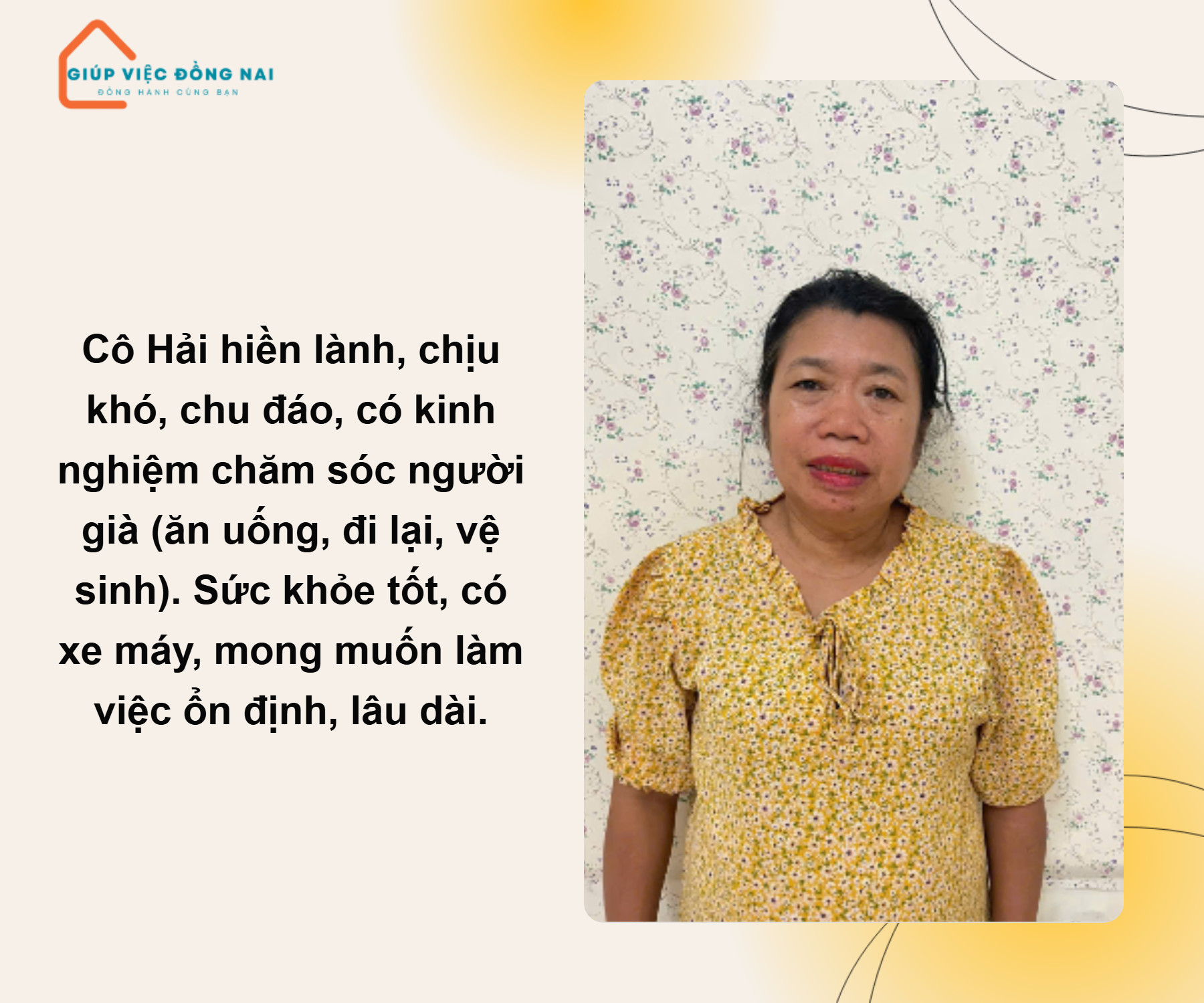 Kinh nghiệm: + Trước đây cô từng chăm bé từ sơ sinh đến lớn tại Nha Trang + Chăm bà đi lại yếu ở Bình dương được 9 năm + Chăm bà đi lại yếu ở Trảng Bom được 5 năm + Chăm bà đi lại yếu ở Biên Hoà được 2 năm. Ưu điểm: + Cô tính tình hiền lành chịu thương chịu khó làm việc chu toàn trong gia đình, rất vui vẻ nhiệt tình, nên có việc là làm liền. + Biết cách cho ăn uống theo giờ giấc và chế độ dinh dưỡng cho ông bà, có thể dìu dắt ông bà tập đi lại, đút ăn, thay bỉm vệ sinh sạch sẽ đảm bảo sức khỏe tốt cho ông bà + Có thể trò chuyện tâm sự để ông bà đỡ chán, uống thuốc men theo đúng giờ giấc gia đình đưa ra + Rất yêu thương người lớn tuổi quan tâm chăm sóc chu đáo cần mẫn, hiểu được tâm lý người lớn tuổi + Sức khỏe cô rất tốt có thể thức khuya dậy sớm chăm sóc ông bà, có thể làm được nhà lầu không ngại công việc khó + Chạy xe máy tốt, phụ đi chợ mua đồ dùng cần thiết hoặc chở ông bà đi khám bệnh được + Mong muốn công việc gắn bó làm việc ổn định và tận tâm cho gia đình