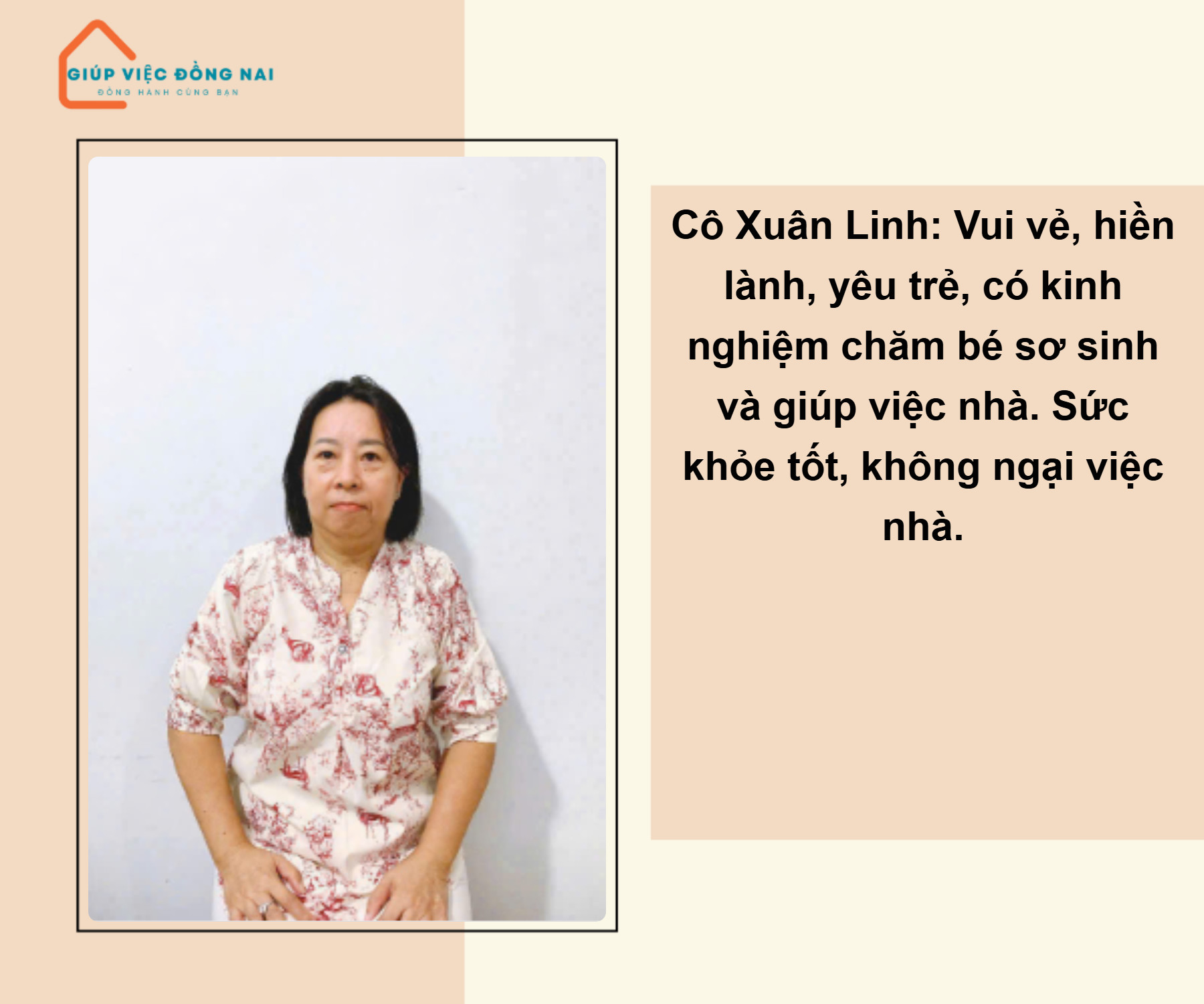 + Chị rất yêu các bé, chăm rất tận tâm, lo cho bé ăn ngủ đúng giờ. Tối có thể ngủ với bé, tự tin chăm giỏi các bé độ tuổi sơ sinh tới lớn