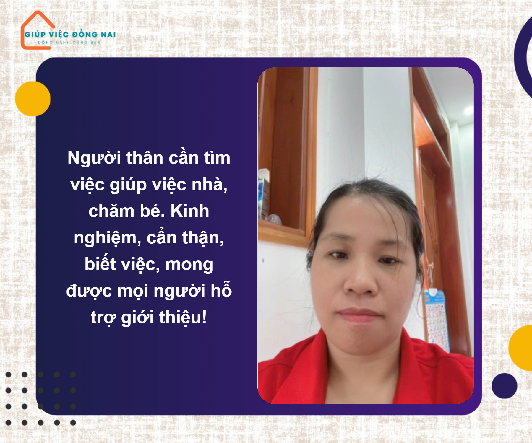 + Tính tình chị là người giản dị, chân chất, thái độ công việc tốt, hiền lành hiểu chuyện, việc nhà cửa nấu ăn dọn dẹp cô có thể phụ làm được.